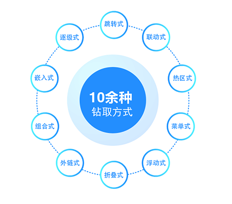 提供了十余種鉆取方式,并采用向導式的定義,鉆取方式包括:逐級式、跳轉式、聯動式、熱區式、菜單式、浮動式、折疊式、外鏈式、組合式、嵌入式等。