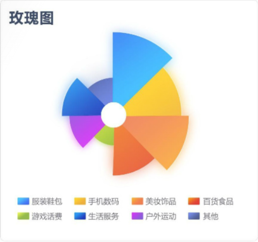 玫瑰圖適合用于對比各類別的數據,而相比柱圖/條形圖等圖表類型來說,南丁格爾玫瑰圖能夠放大數據差異。因為它使用扇區(qū)半徑來表示數據的大小,半徑和面積的關系是平方的關系,用戶直覺上會通過面積來感知差異,所以它會將數據的比例大小夸大。