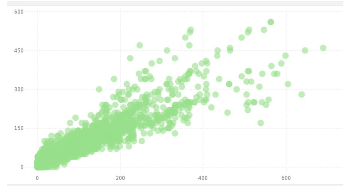 散點圖可以顯示數據集群的形狀,分析數據的分布。通過觀察散點的分布,可以推斷變量的相關性。
